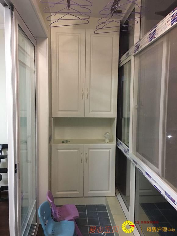 阳台的区域主要还是用来晾晒衣服为主把,阳台打了储物柜,升降晾衣杆简单实用,非常的方便。