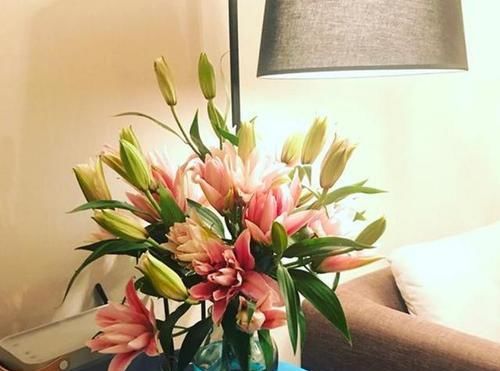沙发旁在装修时是用一个鲜花去给它进行着点缀,让整个空间都会有着自然而又时尚的气息,要知道在灯光的照射下会让空间有着更为柔和的浪漫感,生活中的她还是有着小女生的那种浪漫感情。