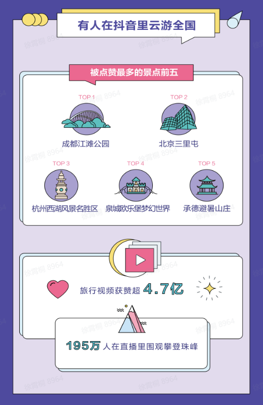 此外,“五一”假期中,抖音上的旅游相关视频获赞超4.7亿次,成都江滩公园成为获赞最多的景点。