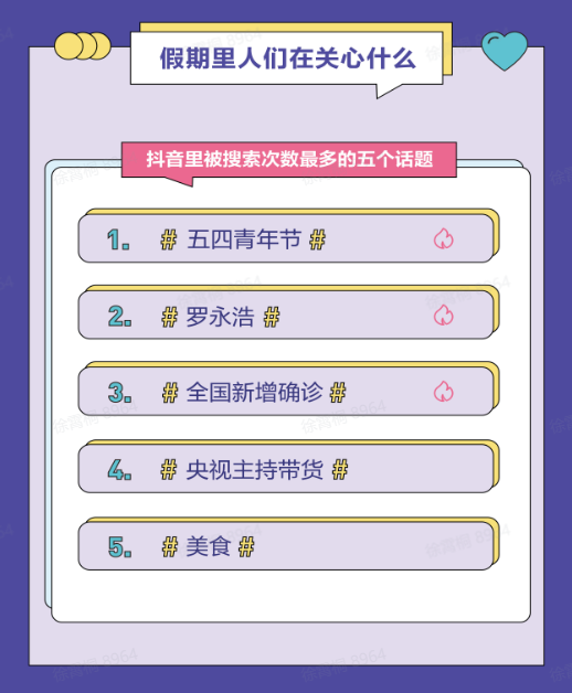 假期之中,抖音用户搜索最多的五个话题分别为,五四青年节、罗永浩、全国新增确诊、央视主播带货和美食。三个话题分别对应,五四青年节,直播带货和疫情信息。