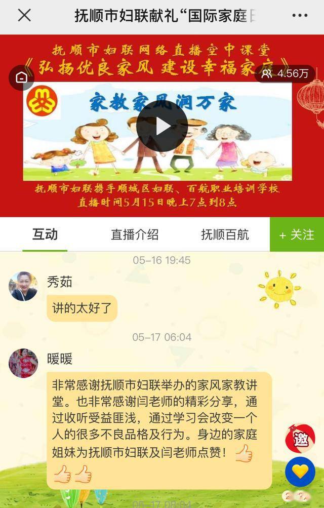 为了让更多家庭参与到此次活动中来,开播前,市妇联利用“抚顺妇女之家”微信公众号发布预告,并组织各级妇联、10所家庭教育试点校发动广大妇女、家庭准时收看。直播开始十分钟,收看人数就迅速达到1.67万人。家长们在收看的同时,纷纷跟随老师思路留言、点赞,直到直播结束,直播间互动不停,十分火爆,共4.56万人次参与了学习。家长们纷纷表示,通过学习,更加充分的认识到家风家教的重要性,也学到了跟孩子沟通交流的具体做法,希望以后有更多机会可以参与家庭教育知识的学习,尤其欢迎这种送课进家的直播学习。