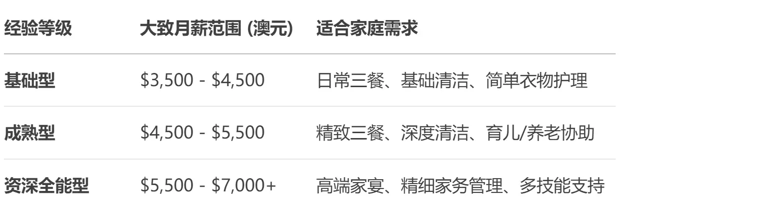 1. 技能深度与经验值: 能否熟练烹饪中澳菜肴?是否掌握专业收纳技巧?有无照顾婴幼儿、老人或宠物的专长?技能越全面、经验越丰富,价值自然越高。