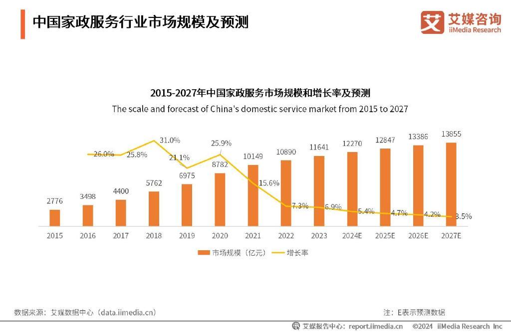 iiMedia Research(艾媒咨询)数据显示,中国家政服务业市场规模增长较快,从2015年的2776亿元提升至2021年的10149亿元,进入万亿级市场行列,2023年市场规模达到11641亿元。在政策推动行业规范化发展、居民消费水平提高、市场对育儿和养老服务需求明显增加等因素的共同推动下,中国家政服务市场规模将保持平稳的增长态势,预计2026年有望突破13000亿元。艾媒咨询分析师认为,随着中国老百姓生活水平和品质需求的提升,家政服务市场需求持续增大;且在家政机器人应用场景逐渐拓宽的背景下,家政市场结构将有望发生较大变化。