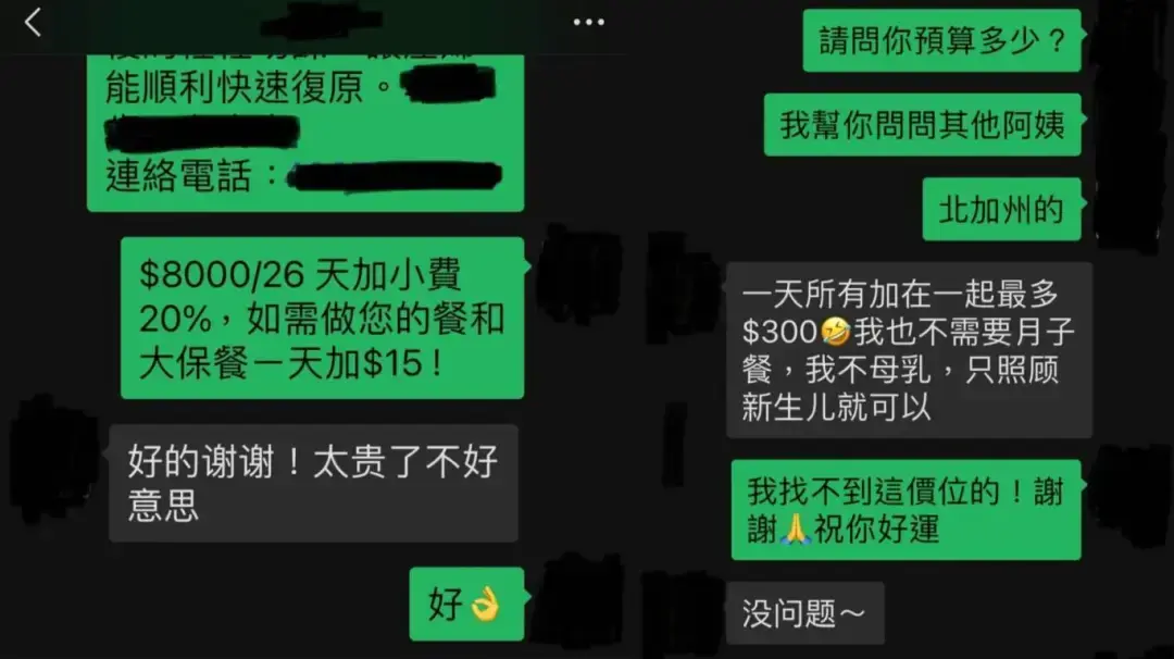 ZipRecruiter最新数据显示,加州旧金山保姆的平均时薪是27美元,但现实远不止于此,尤其是华人保姆。在经历疫情之后,漫天要价、重单毁约、上工偷懒的情况比比皆是,整个家政市场惨不忍睹。According to the latest data from ZipRecruiter, the average hourly wage for nannies in San Francisco, California, is $27, but the reality is far higher, especially for Chinese nannies. Since the pandemic, exorbitant prices, reneging on contracts, and slacking on the job have become commonplace, leaving the entire domestic service market in a dire state.此前有中介发帖称:26天,$300/天在湾区连一个只照顾新生儿的华人月嫂请不到,不少人吐槽:美国保姆照顾两个小孩才$25/h,华人阿姨都是天价了。据此有人爆料,阿姨一般都会有自己的群,报价不能低于某个价格,否则会被其他人集体批斗拉低了市场价……A post from an agency claimed that it couldn't even find a Chinese nanny in the Bay Area to care for just a newborn for $300 per day for 26 days. Many people complained that American nannies caring for two children only cost $25 per hour, while Chinese nannies' prices were sky-high. Someone also revealed that nannies typically have their own groups, and their quotes can't fall below a certain price, otherwise they'll be collectively criticized and drag down the market price.