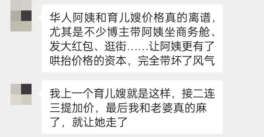 此前有中介发帖称:26天,$300/天在湾区连一个只照顾新生儿的华人月嫂请不到,不少人吐槽:美国nanny照顾两个小孩才$25/h,华人阿姨都是天价了。据此有人爆料,阿姨一般都会有自己的群,报价不能低于某个价格,否则会被其他人集体批斗拉低了市场价……