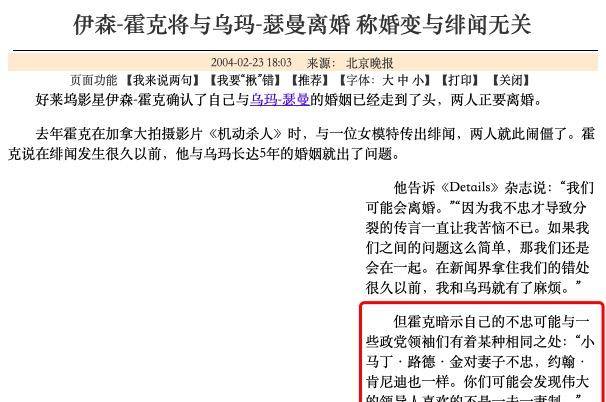 但是伊桑·霍克一直否认离婚的原因是因为出轨,他说他与乌玛·瑟曼的婚姻早就出现了问题。注意他的措辞,他不是否认出轨,只是否认离婚是因为出轨。