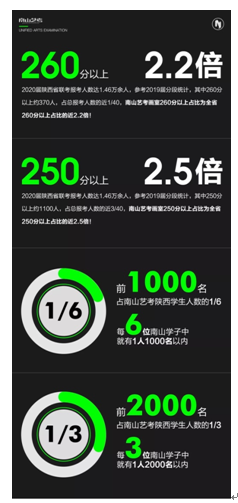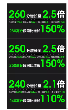 截至目前成绩完整统计,2020届联考中南山艺考画室达240分以上人数为104人,2019届此分数以上仅为50人,同比增长突破2.1倍,占本校陕西考生1/3。此次联考分数在250分以上的学生人数为60人,而19年联考中达到这个分数线的只有24人,增长突破2.5倍,占画室陕西考生的1/6。再看全部陕西省考生中分数达250分的有1100人,占总报考人数的3/40,南山艺考画室在250分以上的占比为全省占比的2.5倍。而分数在260分以上的有20人,2019年联考中达260分的仅仅有8人,相比增长突破2.5倍。在全省所有参考人数中达260分以上的约为370人,占总报考人数的1/40,相比之下,260分以上高分段,南山艺考的占比为全省占比的2.5倍。无论哪一分数段,陕西西安南山艺考画室实现了2018年,2019 到2020连续三届的高分增长,2020实现翻倍增长,均远远高于全省平均水平。