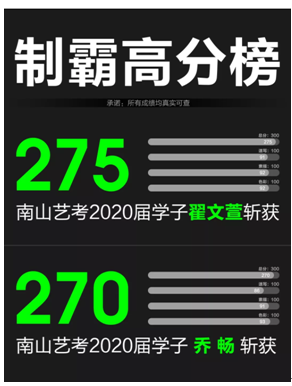 而就高分个人看,南山艺考画室学员2020联考中斩获270分和275分的高分成绩。单科分数在90分以上的高分卷占全校陕西学生人数的1/5,平均每5位南山学子就有1人单科90分以上。从全部的高分占比,到单科的高分占比,南山艺考实打实的数据无一不在证明制霸高分榜不只是说说而已。