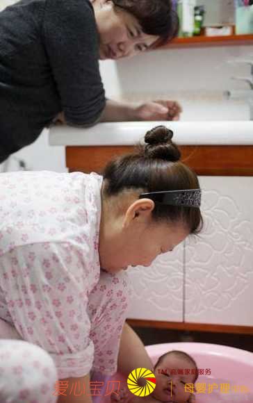 图为做完抚触后,王艳给宝宝洗澡。“宝宝别怕,王妈妈会抱住你的”,宝宝的奶奶靠在一旁学习,等王艳走后,她便负责照顾宝宝。一般新生儿都出生在医院里,母婴医院都有配套的服务,月嫂是家政服务人员中最忙碌的群体。