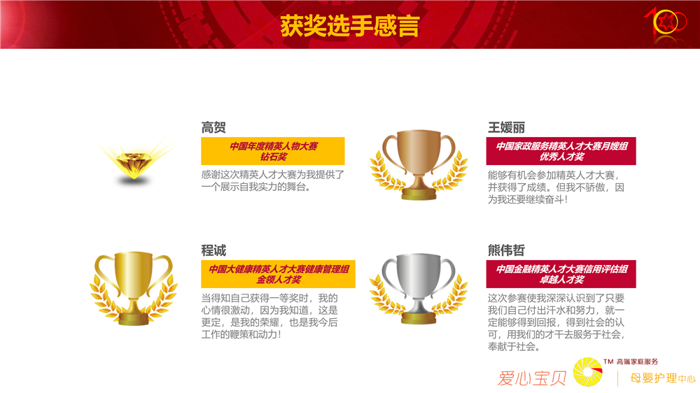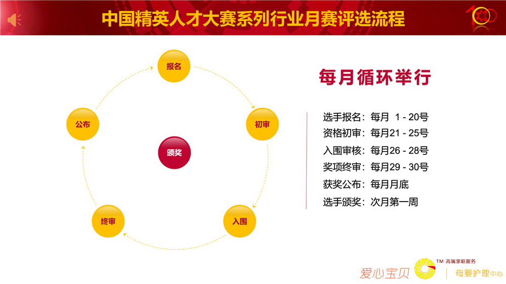 本次大赛采用社会推荐的报名方式,组委会、执委会和评委会三方结合的评审流程,对所有参赛者采用统一标准进行评判,再加上严格的赛制管理,从而确保大赛公平、公正、公开!最终在各组赛事中分别评选出精英人才奖、杰出人才奖、卓越人才奖、非凡人才奖、金领人才奖、新锐人才奖和优秀人才奖各若干名,获奖选手选手同时也获得在每年1月举办的“中国年度精英人物大赛”的参选资格。