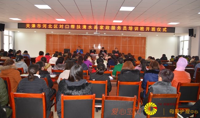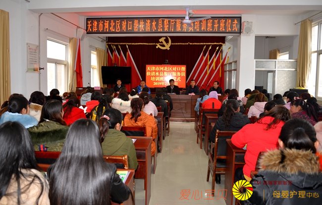 为全面贯彻落实中央、省市关于打赢脱贫攻坚战以及东西部扶贫协作的决策部署和工作要求,全力稳定和扩大就业,促进农村劳动力特别是建档立卡贫困劳动力转移就业及农民工返乡创业,2月14日,天津市河北区人社局对口帮扶清水县家政服务暨餐厅服务培训班开班,清水县政府副县长马小平,河北区就业训练中心主任刘通,河北区选派培训教师,县人社局、永清、白沙两镇负责人以及培训学员共200多人参加开班仪式。