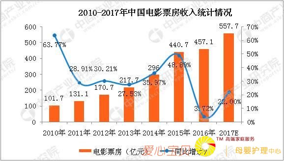 2014年,全国电影产业总收入达到 363.7 亿元,同比增长 31.5%。其中票房收入 296.4 亿元,同比增长 36.2%;2015 年,全国电影票房收入 440.7 亿元,同比增长 48.7%,电影票房近两年实现持续、高速增长 17 。2016 年,全国电影票房在“第三方”票补减少、“电影制作小年”、银幕增速过快等因素的影响下,整体增速放缓,全年票房达到 457.12 亿元,增速为 3.73%。2014 年,中国电影行业总规模已经超越日本成为仅次于美国的世界第二大电影市场,且同比增长率维持较高水平。2015 年,全球电影总票房约 383 亿美元,其中中国贡献了约 68 亿美元。而到2017年全球电影总票房达到了406亿美元,其中以中国内地的贡献最大——总票房达到了79亿美元。可见,未来全球电影市场发展的核心在中国。