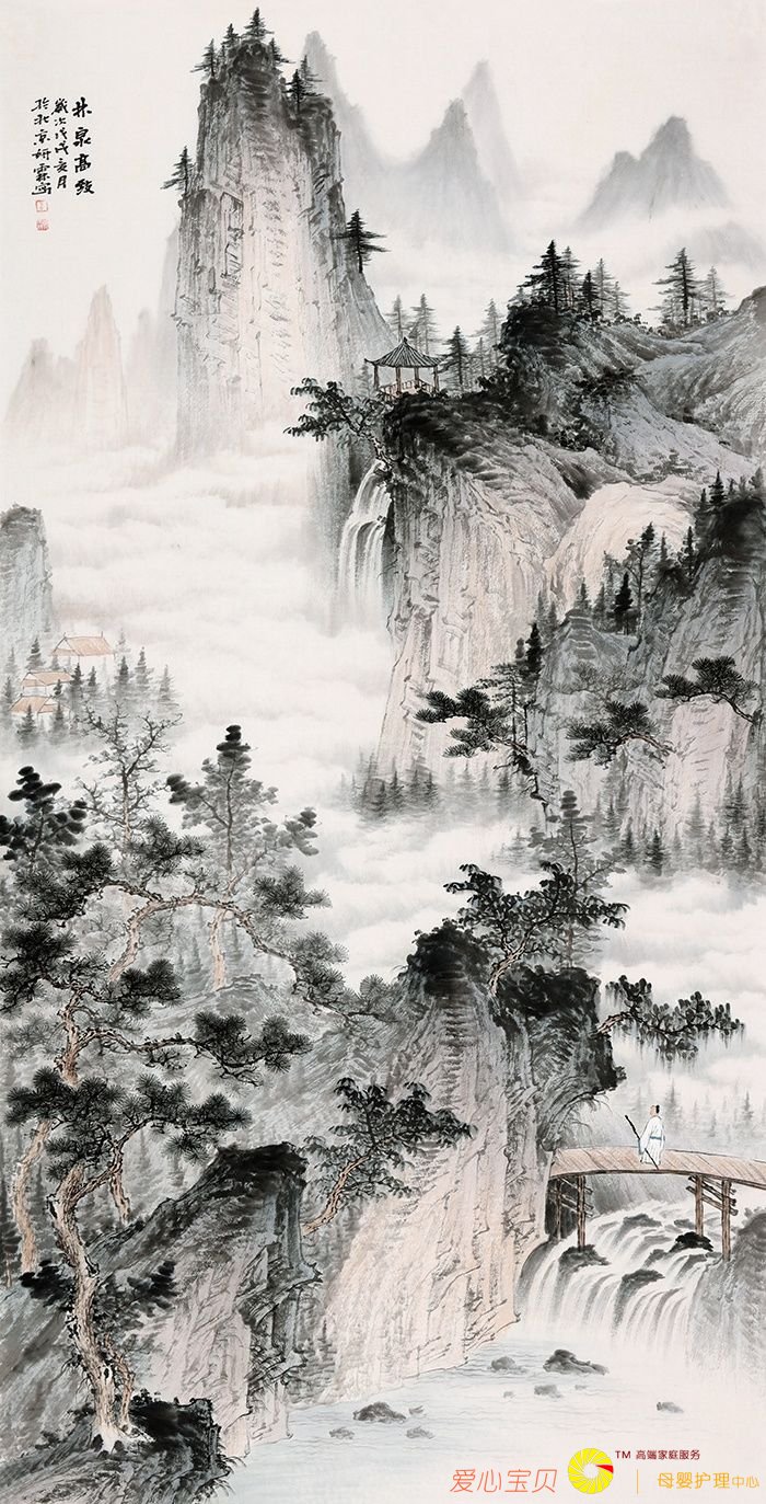 这幅雅致的《林泉高致》用墨浓淡相宜,画风古朴大气,山峰巍峨、高耸入云,恰到好处的墨色植物在山峰上点缀,更增添了古韵的气息,山间云雾苍茫,一片浩然正气之态;云雾之间,几座雅致的房屋错落有致,彰显出画家作画时闲逸自在的心情;近处的横桥上一位身着白衣的雅士遥望着远处的风景,显得极为安逸。