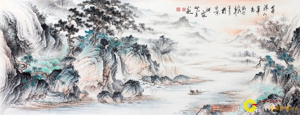 峡江烟云,场景辽阔,恢弘大气,意境飘渺悠远。品读李佩锦老师的山水画,仿佛置身于人间仙境一般,她以意造境,以心绘画,像诗一般地抒情呤唱,房屋、雾气、树木、湖水、峡江、山居者与帆船,有着极强的参与性,充分体现了画家对山水的依恋,具有鲜明的时代风范。