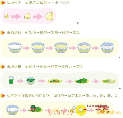 宝宝在开始添加辅食时,还没有长出牙齿,只能给宝宝喂流质食品,逐渐再添加半流质食品,最后发展到固体食物。例如:米糊→粥→软饭。