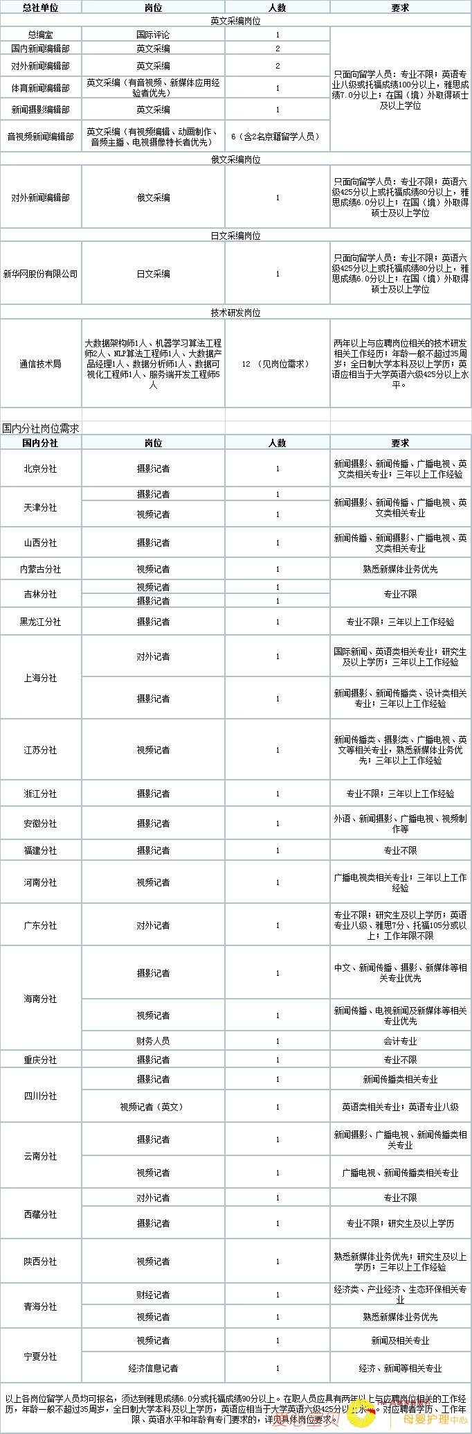 新华社 一、报名条件 1.具有中华人民共和国国籍,遵守中华人民共和国宪法,无参加非法组织或活动及其他不良记录。 2.牢固树立马克思主义新闻观,具有较高的政治素质、业务素养和较强的敬业精神。 3.所学专业与岗位...
