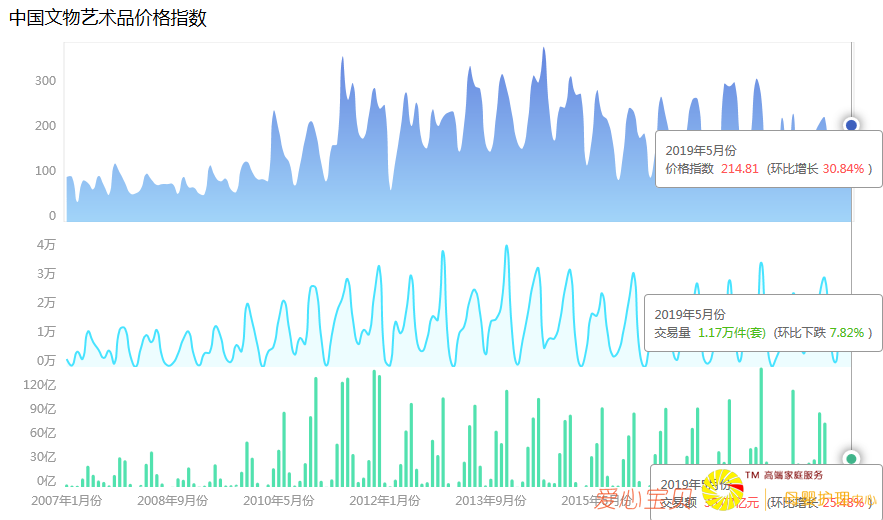 据全国文物艺术品拍卖市场价格监测显示,2019年5月份中国文物艺术品价格指数为214.81点,环比增长30.84%,同比增长129.50%。5月交易量为1.17万件(套),环比下降7.82%,比去年同期提高400件(套),涨幅3.54%;交易额为35.07亿元,环比上升25.48%,比去年同期提高11.69亿元,涨幅高达50.00%。