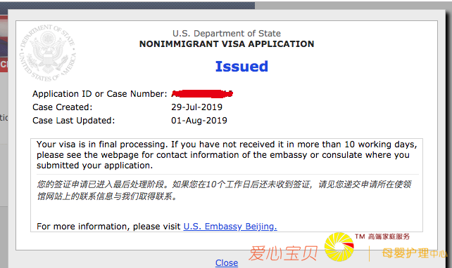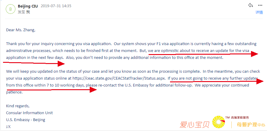 2019年7月30日学生当天面签顺利通过,并发放了签证通过的note。但是在没有拿到护照签证前,美嘉老师是不会放松的,一直查询签证状态,显示administrative processing,这种情况下,美嘉老师立即联系了使馆,使馆回复如下:“Our system shows your F1 visa application is currently having a few outstanding administrative processes, which needs to be finished first at the moment. But, we are optimistic about to receive an update for the visa application in the next few days. Also, you don’t need to provide any additional information to this office at the moment.”