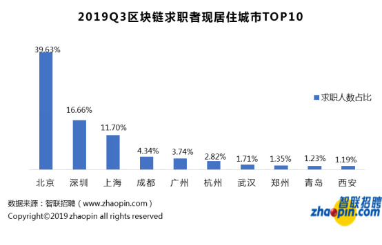从2019年第三季度区块链招聘需求的城市分布来看,人才需求主要集中于一线和新一线城市,与人才求职城市分布对应,且人才供给明显更集中在一线城市。