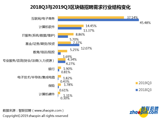 从行业分布看,2019年三季度,互联网/电子商务和计算机软件行业对区块链人才的招聘需求占所有行业的比例分别为37.14%和14.45%,占需求主流。需求前十的行业还包括IT服务、基金/证券/期货/投资、教育/培训/院校等。