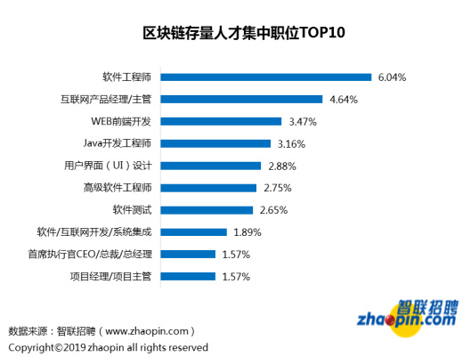 随着大家对区块链的认识深入,作为底层技术的区块链,其发展空间来自于与各行各业的应用融合。虽然行业整体降温,但对于真正将区块链技术或产品作为核心业务的企业,技术人才和销售人才都是不可或缺的,在招聘需求中,软件工程师是需求最多的岗位,占比7.89%。其次是销售代表,占比6.6%;高级软件工程师占比3.93%,可见技术类岗位首当其冲是企业揽才的第一目标,其次是帮助公司实现盈利的销售团队。