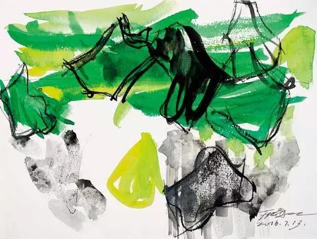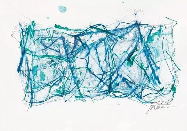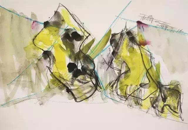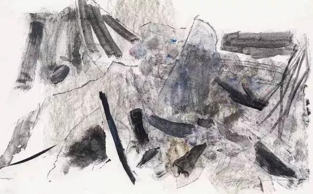 《山水赋之十九》75x52cm 卡纸上色粉笔、水彩、铅笔及蜡纸拼贴等 2015年