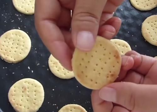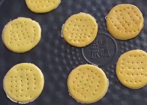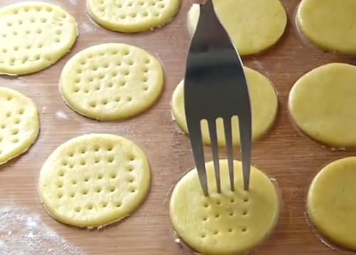 【第三步】:随后我们准备一个叉子,在饼干的表皮多插几下。这样做的主体作用就是为了防止饼干鼓起,毕竟在很多面食烙制的情况之下,都会有鼓起现象,这样能使做出来的饼干外观整洁美观。