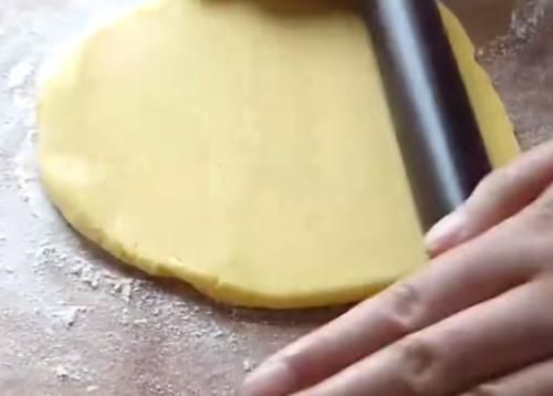 【第一步】:首先我们把揉好的面团用擀面杖擀成很大张的薄饼,厚度控制在1mm左右,越薄越好,因为这样做出来的饼干才会又脆又香。