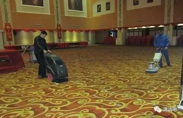 因为酒店的地毯每天都有人踩,一般经过十五天至一个月的时间后,一些表面性的污渍就会显露出来,这时候就要对其进行有效的表面清洗。最常用方法是用单擦机配干泡地毯剂去进行清洗处理,干泡地毯剂有快速分解和还原本色的作用,且挥发迅速,经清洗和吸水工序后,约4小时地毯就能正常使用。