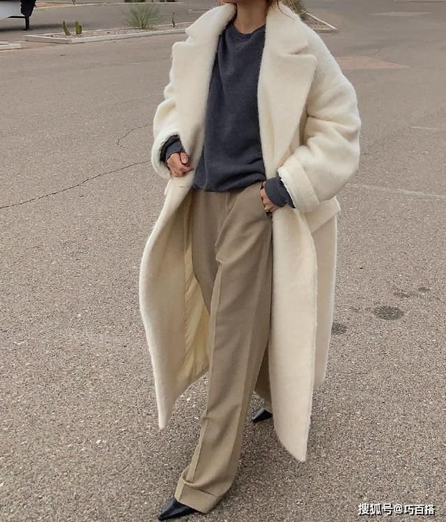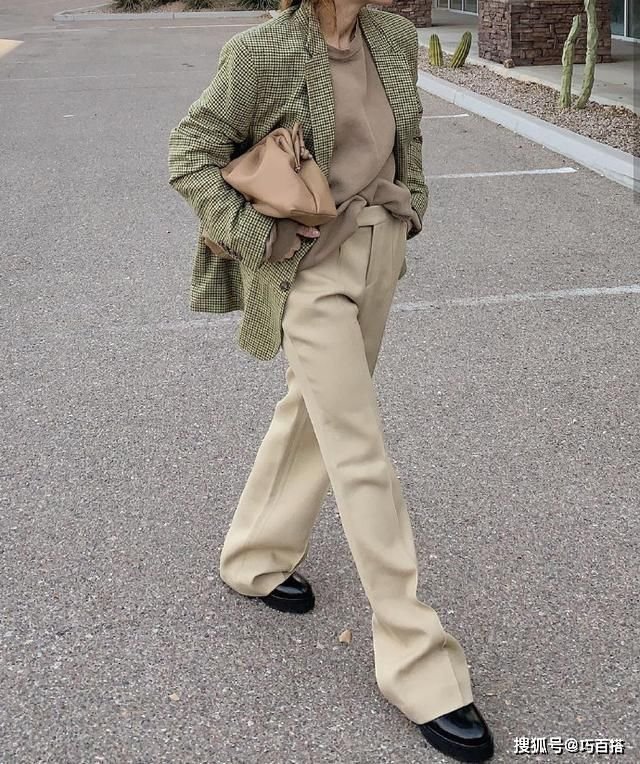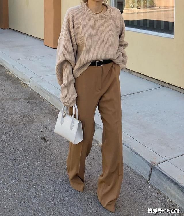 想要穿出大长腿的女生,还可以借鉴这一组look,选择尖头鞋与阔腿长裤同色的穿法,进一步延伸腿部线条,妥妥的显高。只是对于爱干净的女生来说,这种盖住鞋子的拖地裤搭配,并不适合你,不仅不耐脏还显得太过拖沓。