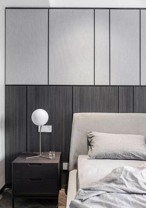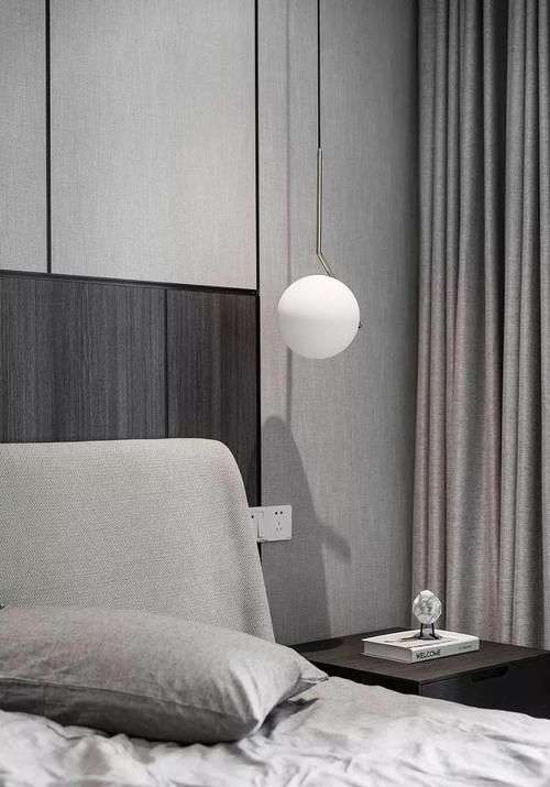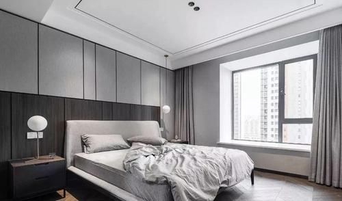 主卧延续了公区一致格调,高级灰的色调下,让空间气质十足。不同造型分割的布墙布系统背景墙为空间增添一份稳重,阳光倾泻下来的午后,让卧室更为温馨。