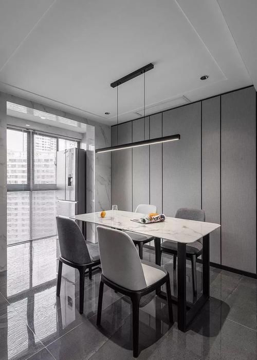 餐厅高级灰的布墙布系统,不同分割的金属线条点缀,提升空间的耐看度与品质感,极简的吊灯,聚焦视线,让空间更有层次。