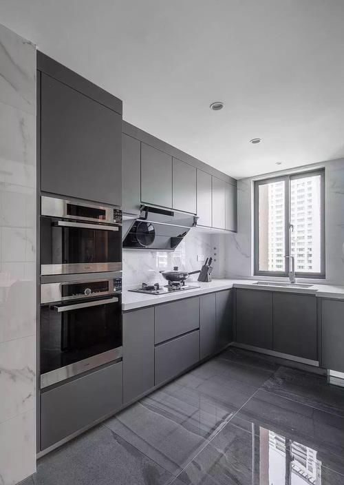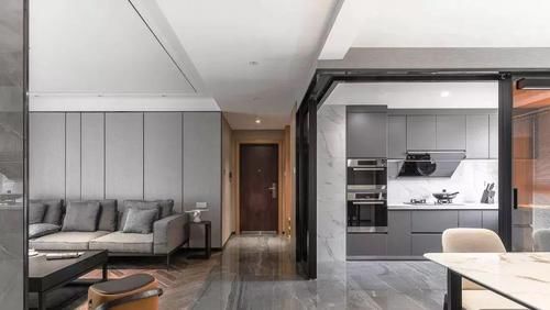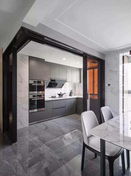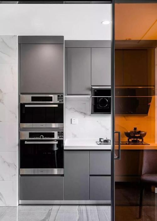 空间的开合,色彩的解构,在不同的状态和光线下,充满不同的趣味与变化,厨房橱柜采用高级灰色柜体与白色石材台面,搭配时尚的灰色地砖与爵士白瓷砖,相互呼应,相得益彰。