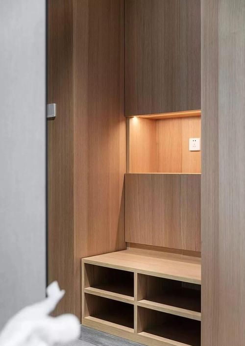 利用入户玄关的凹口,做了一组收纳柜,及可以移动的换鞋凳,换鞋凳也可以充当平时日用的收纳功能,一举多得。