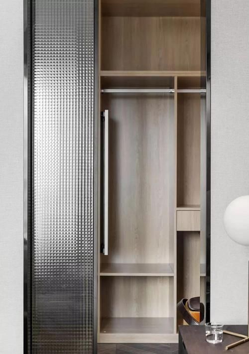 长虹玻璃的内嵌移门拉开,内部则是衣帽间,满足女主人的衣物收纳与梳妆功能,梳妆台靠窗,梳妆的时候就不用打光了。