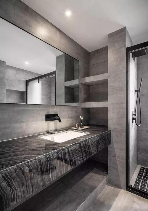 延续整体风格的色系,采用哑光面的灰色系瓷砖,搭配现代极简的黑色长虹磨砂门,显得个性时尚。