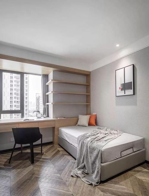 利用拐角的结构,做了一组写字桌和书架收纳展示,整体色系提升了两个度,让孩子房子相对明亮,且不失整体空间格调品质。
