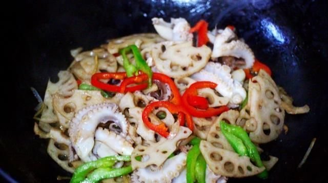 【配料】藕,桃花蛸,葱,姜,红椒和青椒,生抽等