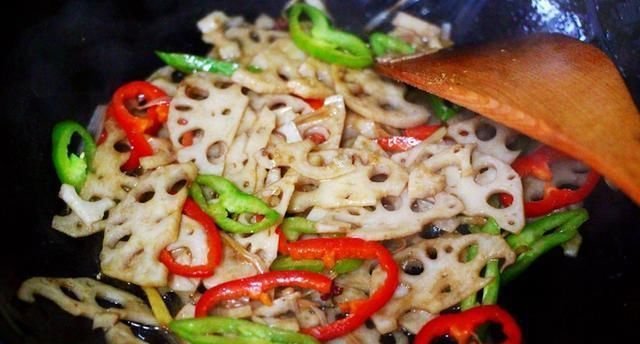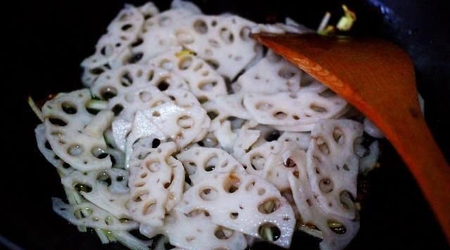 5、这个时候将焯水后的藕片也加进去,藕片加进去之后继续的大火翻炒,翻炒均匀之后再加入适量的花椒粉提味,要是不喜欢也可以不放。再添加少许的生抽调色,最后就是根据口味添加食盐和鸡精了。鸡精可以提味,要是不喜欢也可以不加。