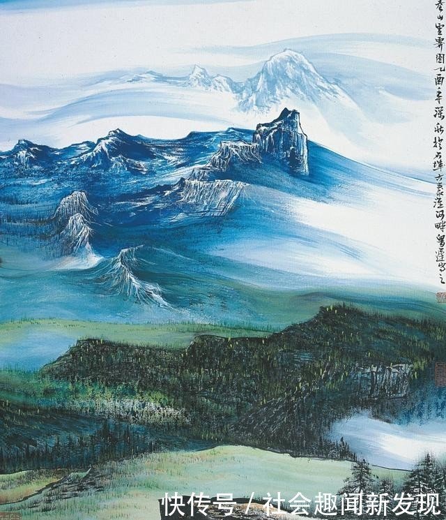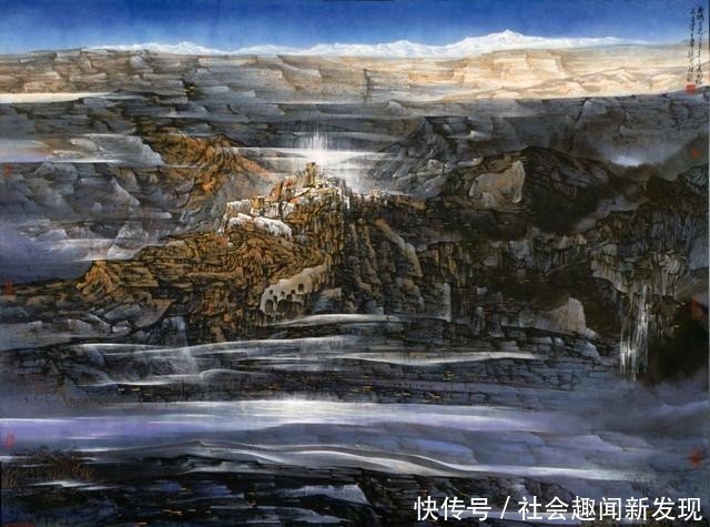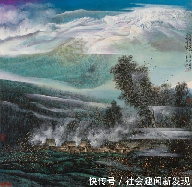 鲁迟笔下的山水具有独特的视觉图式。他坚守融合古今,折衷中外,借古开今,继承创新,笔墨大胆随意,奔放泼辣,自然巧妙地采用西方绚丽浓艳色彩。他笔下的大山、大水,蓝天、白雪,绿茵、黄土,红光、紫气,丰富和谐,融为一体,使人们深切地感悟到澎湃的艺术气势,不由自主地进入既雄浑迷茫又清新雅致的艺术意境,吸引人们在朴茂之美中,领略独特的隽永含蓄的东方情调。他大胆采用好似落茄、好似雨点、好似牛毛的独特皴法,自然形象地凸显出大山、大水、巨石的纹理、肌理和秩理,透射出雄浑秀丽的磅礴气韵。