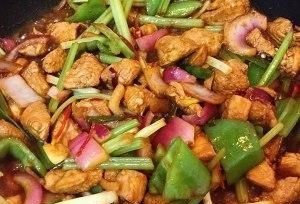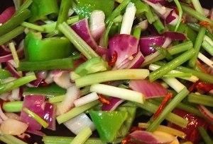 蒜和姜切片,葱和香芹切段,洋葱和青椒切块,干红椒等,一起入锅,花椒油大火翻炒均匀。
