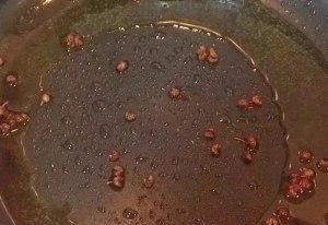 炸花椒油:热锅热油,撒入少许花椒粒。中火炸香后捞出花椒,只剩油。(此处注意操作安全,可加盖儿炸,避免油迸溅。待油微冷却再去捞出花椒)