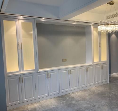 餐厅左侧打了一排的餐边柜,中间留空位置,可以作为喝水区或者可以摆放一些小家电等常用到的东西,柜子两侧都安装了灯,晚上可以起到照明的作用,视觉上显得比较美观。柜子储物空间足够,以后也不会担心,家里没有柜子收纳了。