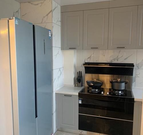 定制橱柜的时候,左侧预留了刚好可以放冰箱的位置,使用很方便。安装的燃气灶质量还不错,而且处理油烟都蛮不错的,定制的橱柜也比较耐脏,很方便做保洁。