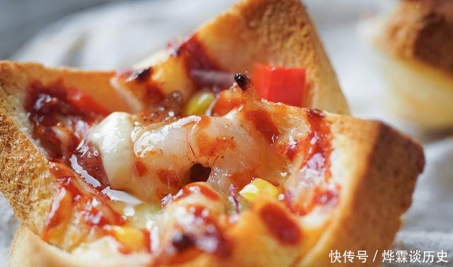 往放凉的吐司中,加上适量虾仁、洋葱丁、红甜椒丁、培根块、青豆、玉米粒,再加入少许盐和黑胡椒粉调味,撒上15g马苏里拉芝士,最后挤上少许番茄沙司。