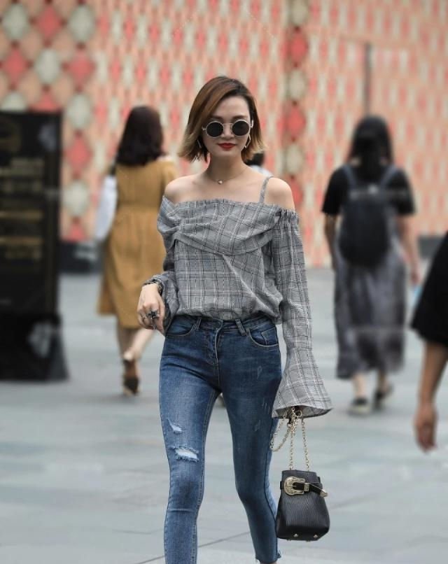 2.面带微笑气质怡人的小姐姐,戴一副酷酷的太阳镜出街,蓝色牛仔裤搭配一字肩上衣,穿上更加的美观独特,可以尽显清爽迷人的好身姿。从简约的服装穿出美感,这就是时尚达人能够做到的时尚美。这位小姐姐迷人的穿搭很有女人味,凸显的白皙娇嫩的肌肤,十分可人。