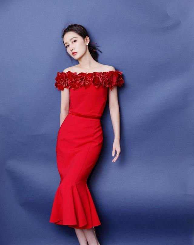 3.在挑选一字肩的纯色连衣裙的时候,如果你不想让自己的搭配显得很单调的话,那么我们可以像李沁这样在肩部的位置加入立体的花朵装饰,这样能够让我们的穿搭更加的富有层次感,而且像这种立体装饰也能够给我们带来非常具有个性的一面,同时又能够修饰我们的上半身曲线。此外选用鱼尾裙的设计方法更是能够让李沁看上去很妖娆。