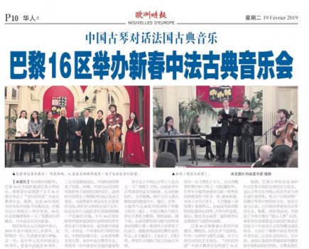 为庆祝中国新年,巴黎十六区市政府邀请巴黎古琴协会、茉莉中法音乐家联盟于2019年2月16日联合举办了“交织的风景”中法古典音乐会。据悉,这是十六区政府首次举办中国春节庆典活动。巴黎十六区聚集着众多的外国使馆、博物馆,文化艺术气息浓厚。作为一台传统与现代交融、东方与西方对话的高雅艺术盛会,此次音乐会得到了十六区政府及中法民众的认可与支持。