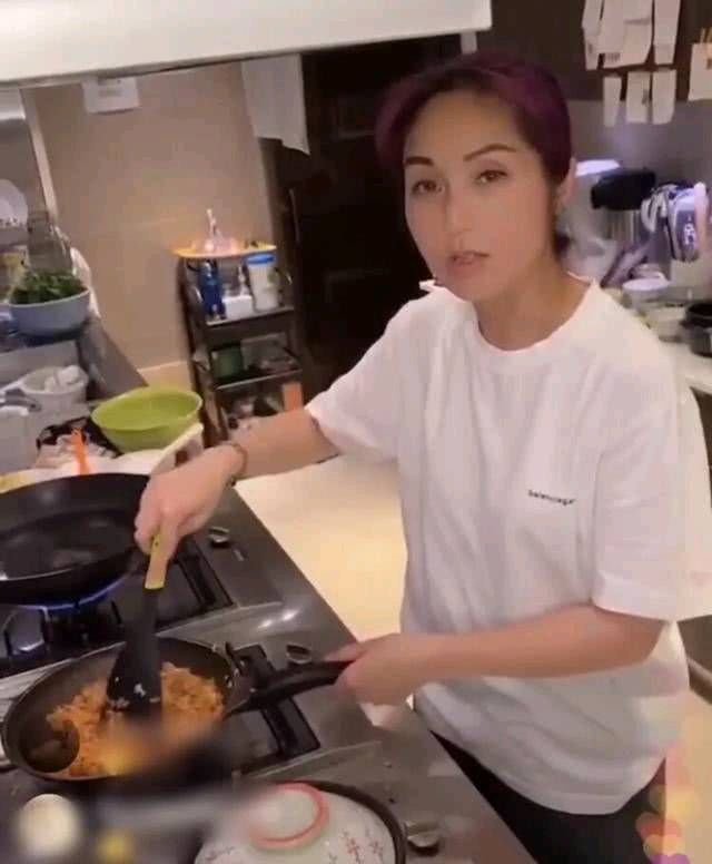 杨千嬅扎着丸子头,身穿白色T恤和黑色休闲裤,一身舒适家居装扮出镜。最让人意外的是她竟然没穿鞋,光着脚在厨房里做菜,真的超接地气。