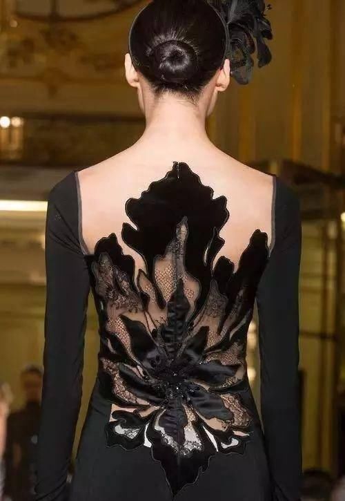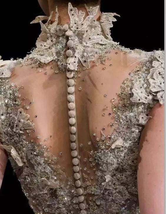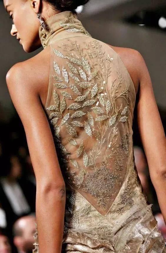 高定礼服会把钉珠和大面积的刺绣在背部,使服装在视觉上显得更加的完整,起背部的曲线在服装的衬托下尤为美丽。